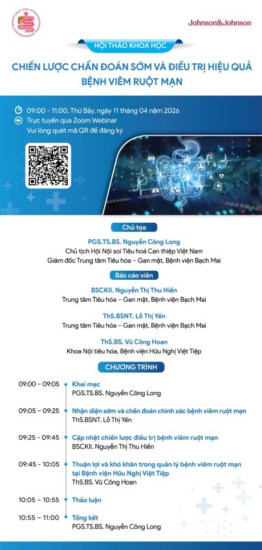 Nhằm cập nhật những kiến thức thực hành lâm sàng trong nhận diện sớm, chẩn đoán chính xác và tối ưu hóa điều trị bệnh viêm ruột mạn, VIGES trân trọng giới thiệu hội thảo khoa học trực tuyến với sự tham gia của các chuyên gia đầu ngành đến từ Trung tâm Tiêu hóa – Gan mật, Bệnh viện Bạch Mai và Bệnh viện Hữu Nghị Việt Tiệp. Chương trình diễn ra từ 09:00–11:00, Thứ Bảy ngày 11/04/2026, theo hình thức Zoom Webinar